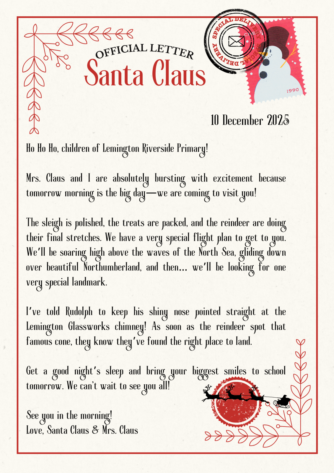 He and Mrs. Claus are visiting Lemington Riverside Primary School tomorrow morning!