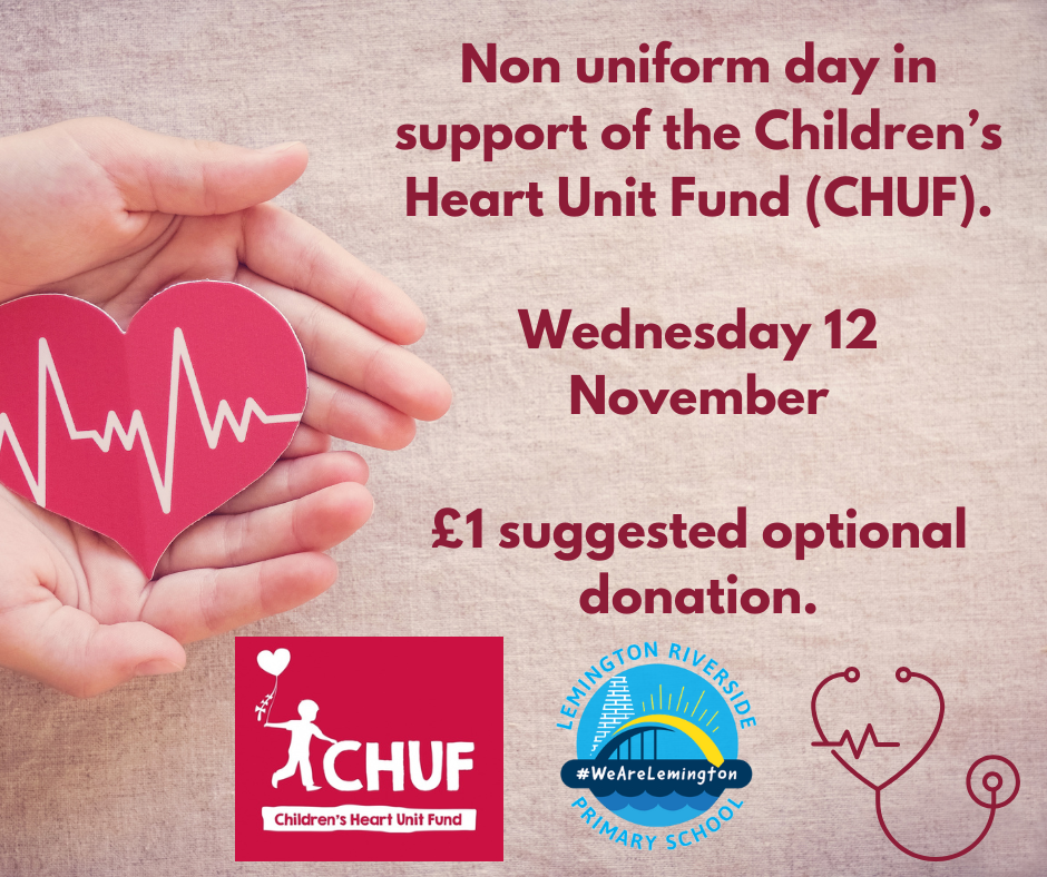This Wednesday, we’re holding a non-uniform day to raise funds for CHUF (Children’s Heart Unit Fund) – a fantastic local charity that supports children and families receiving treatment at the Children’s Heart Unit at the Freeman Hospital and other hospitals across the North East.