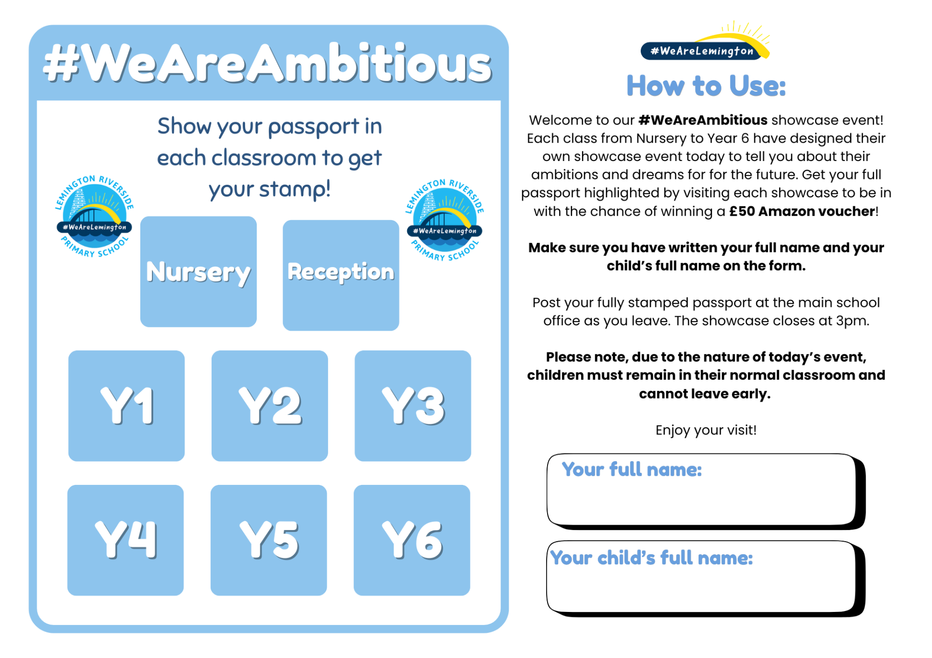On arrival, each adult visitor will receive a showcase passport (like in the picture below). As you visit each classroom, staff will mark your passport. Once you have completed all sections, please hand your passport in at the main school office before leaving. All completed passports will be entered into a draw to win a £50 Amazon voucher!